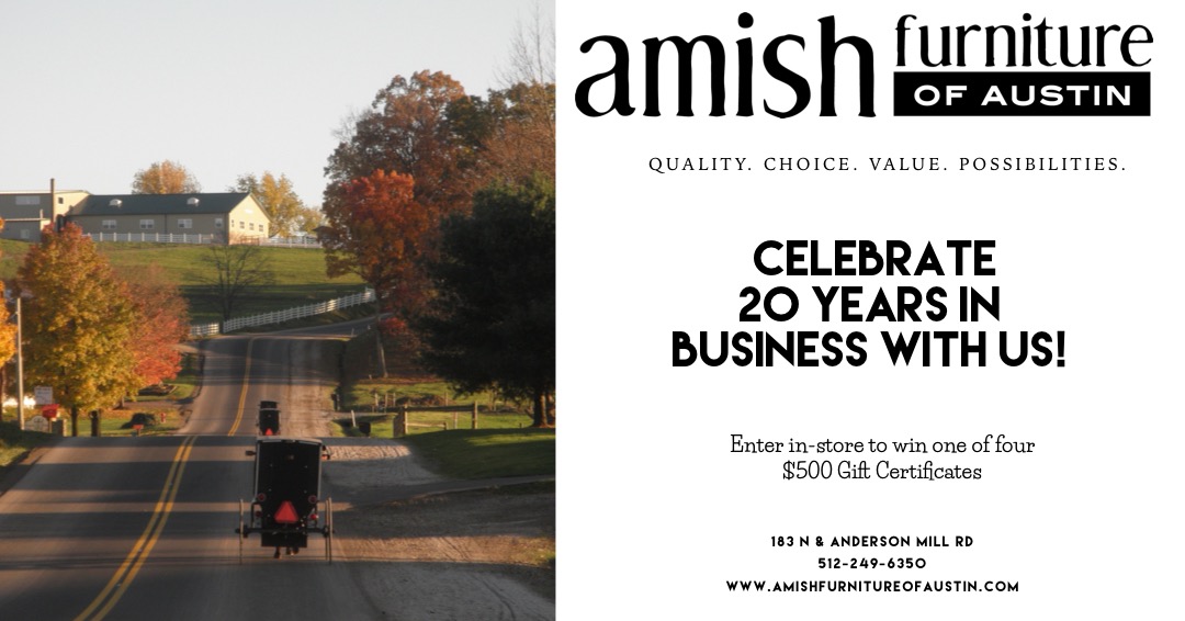 Celebrating 20 years of creating beautiful solid wood furniture! Celebrating 20 years of creating beautiful solid wood furniture! By michael@amishfurnitureofaustin.com|2025-10-13T15:13:16+00:00October 13th, 2025|Anniversary Celebration, Company Updates| Read More